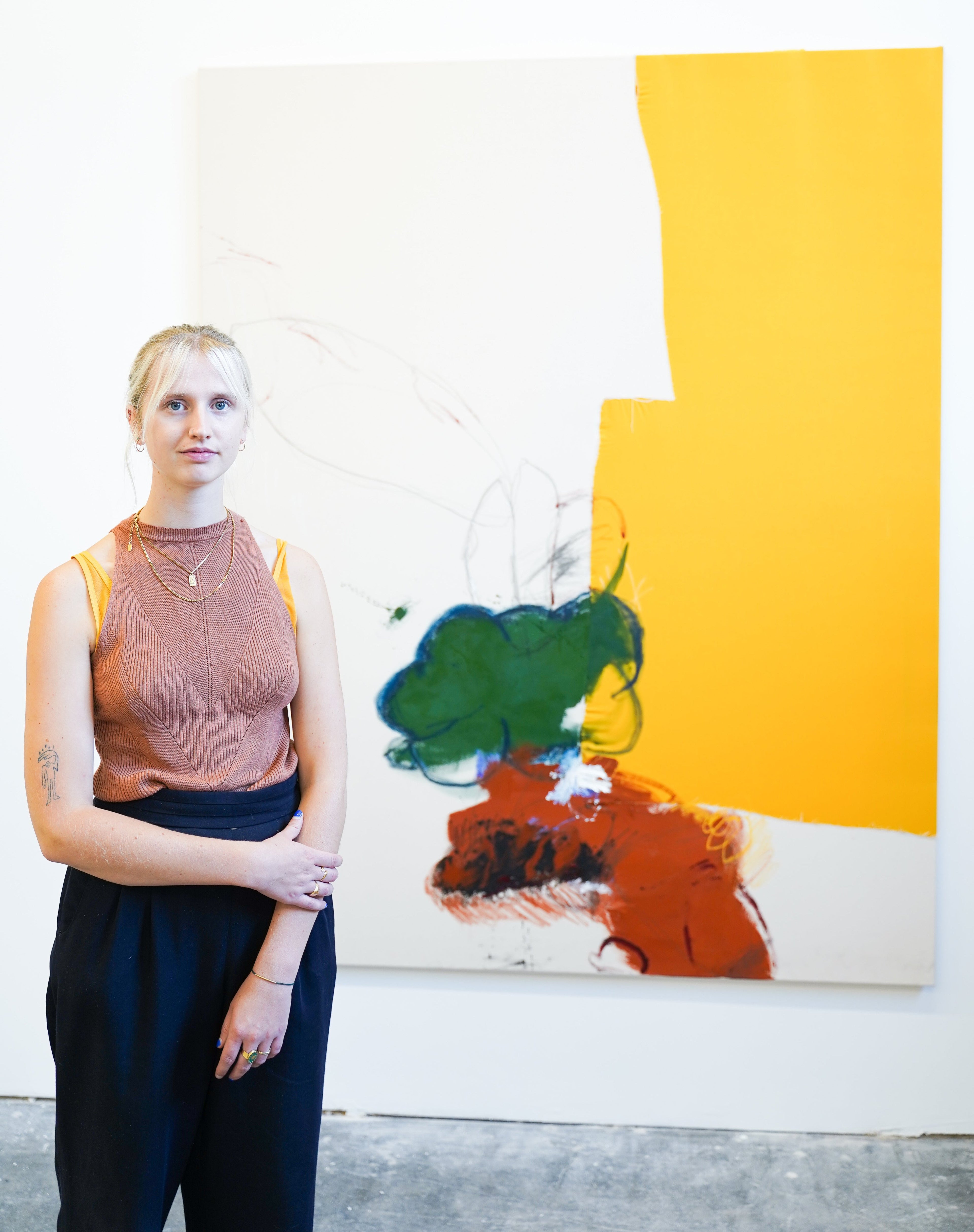 Ik maak mijn verf ook zelf, wat telkens weer interessante experimenten oplevert. In deze print zie je bijvoorbeeld een grote ‘olievlek’. Dit zijn eigenlijk ongelukken die je tijdens het maken niet kan voorspellen, maar die ik enorm boeiend vind. Op deze manier ga ik in dialoog met de materialen en weet ik ook niet exact wat ik kan verwachten. Als maker krijg ik veel energie door toeval toe te laten en ermee te spelen.